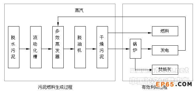 SF法工藝流程如圖2所示。它將未消化的混合污泥經過機械脫水后,加入重油,調制成流動漿液送入四效蒸發(fā)器蒸發(fā),然后經過脫油,變成含水率約5%、含油率10%以下,熱值為23027kJ的污泥燃料。重油返回作污泥流動介質重復利用,污泥燃料燃燒產生蒸汽,作為污泥干燥的熱源和發(fā)電,回收能量。