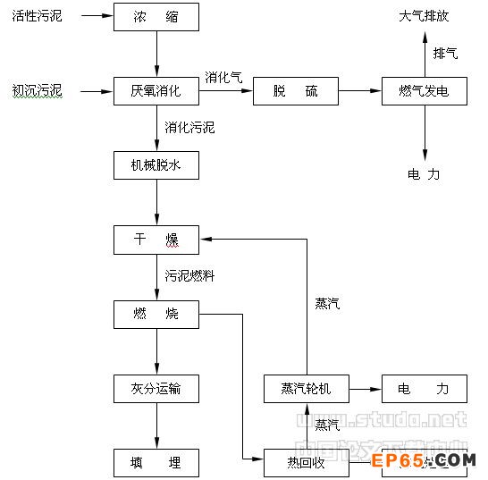 HERS法所用的物料是經過機械脫水的消化污泥。污泥干燥采用的多效蒸發(fā)法一般是用蒸發(fā)干燥法,不能獲得能量收益,而采用CG法可以有能量收益;污泥能量回收兩種方式,即厭氧產生消化氣和污泥燃燒產生熱能,然后以電力形式回收利用。